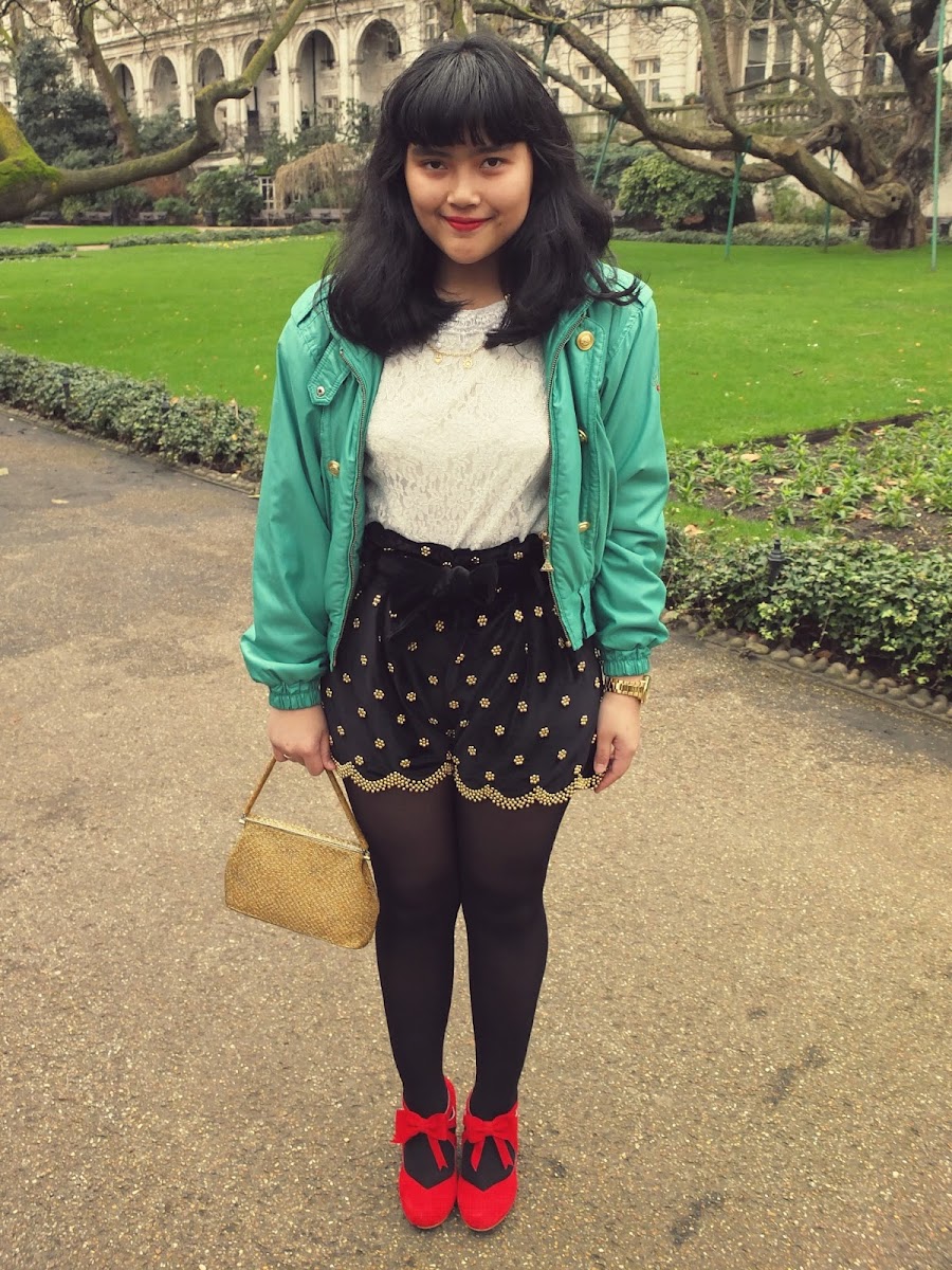 Tosca Bikers Jacket, Lacy Top, Golden Bag - Thrifted | Baroque Inspired Short - Topshop | Red Kitten Heels - OFFICE | Watch - Massimo Dutti | Cat Eye Shades - ADR for H&M